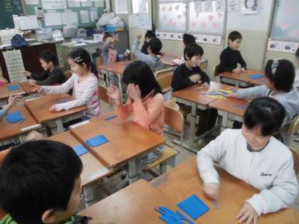 算数科で,「大きいかず」の学習に入りました。今日は,60本の棒を二人でじゃんけんをして,1本ずつとり,とった数を数えて勝敗を決めました。20より大きい数をかぞえるときは,10のまとまりを作って数えるとわかりやすいことを学びました。