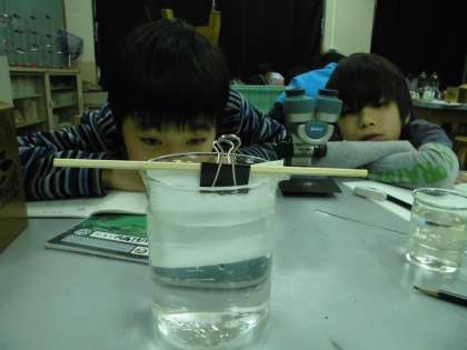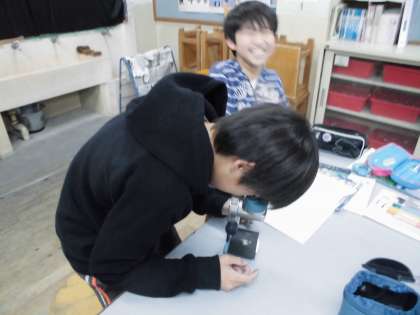 ものがとけるってどういうことか?を観察・実験を通して考えました。まず、食塩と三温糖を水に溶かしました。とけるって色の有無にかかわらず透明であることがわかりました。次に、食塩を顕微鏡で観察しました。普段なめることはあってもじっくり見たことはなく、四角なんやあ、大きさは色々や・・と熱心にスケッチをしました。その後、お茶パックに食塩を入れとけていく様子を観察しました。うわーというどよめきが。と同時に、食塩以外のものもこのようにとけるのだろうか、温めるとどうなるのだろうか、見えなくなったけど、食塩はどうなったのか・・など色々な疑問もうまれました。これから解決していきたいと思います。