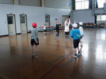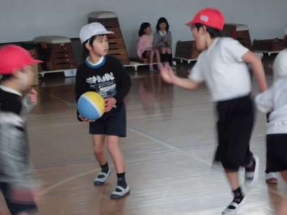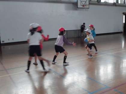 体育の授業でパスゲームをしました。ルールはボールを持ったまま歩かない・味方にパスをする・ゴールすると1点です。初めは寒い体育館もゲームをしだすと汗をかくほど動き回って楽しんでいます。