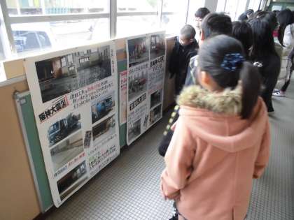 3枚目の写真は、地域の方が「阪神淡路大震災」の時の様子を記録したものを、お借りしたものです。その時の、新林小学校の体育館などが使用できない様子が載せられていました。当時の災害の大きさを知ることができました。