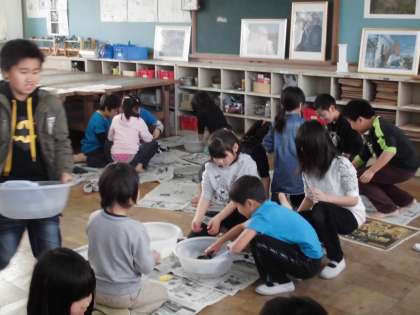 学習後の振り返りでは,「予想以上につかれた。」「今は洗濯機があるから便利。」「大変だったけど汚れが落ちていく様子が分かって楽しかった。」「昔の暮らしは大変だ。」などの意見が出ました。次回は七輪に挑戦する予定です。