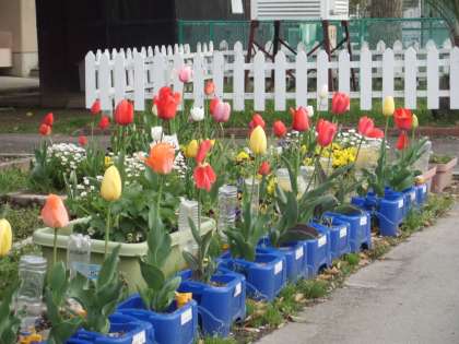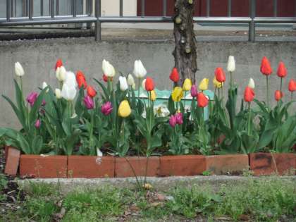 4月9日 おはようございます。今日は少し気温が上がり過ごしやすい天気になりそうです。桜は散り始めましたが,花壇のチューリップが綺麗に咲いています。