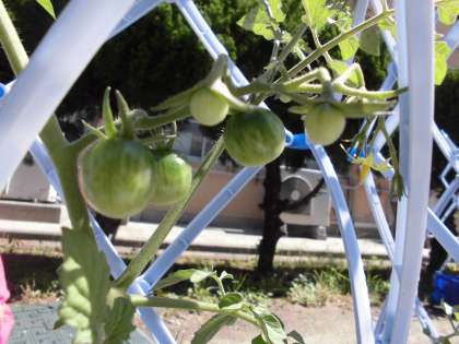 小さかった苗がぐんぐん伸びて,かわいい小さなトマトの実がついていました。