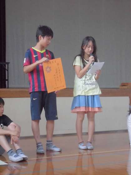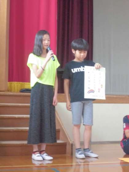 児童朝会で、人権標語を発表しました。