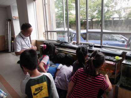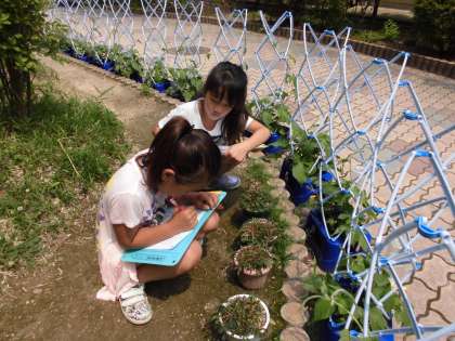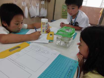 国語の学習で生き物や植物をていねいに観察して,記録文を書く学習をしています。めだかやだんごむし,学校で飼っているうさぎやウーパールーパー,エンゼルフィッシュ,そのほかにも,おじぎそうやトマトなど自分たちで観察したいものを決めてメモをとりました。