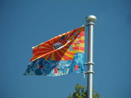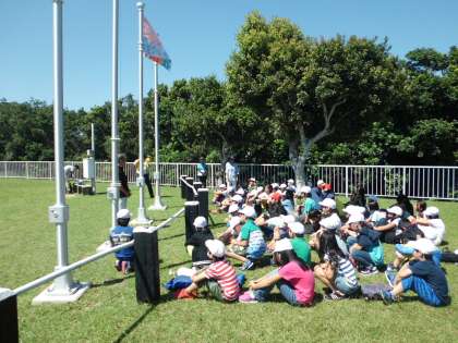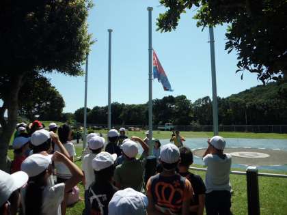 お昼を食べた後、入所式を行いました。みさきの家の所員さんからお話をしていただきました。大きな声で校歌を歌いながら旗を揚げました。