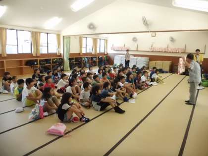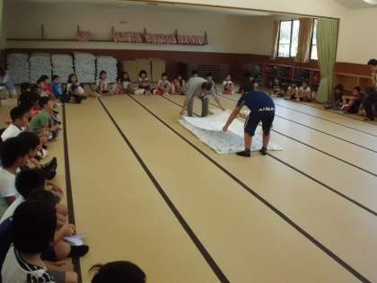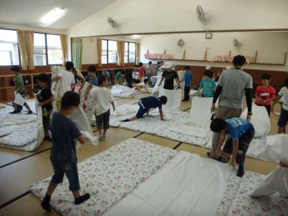 90畳で所員さんから施設の使い方や布団の敷き方を教えていただきました。その後は、寝具の準備をしました。今夜は男子が90畳、女子はバンガローです。
