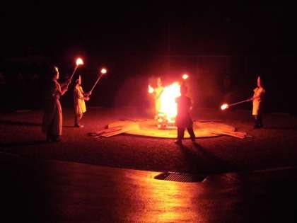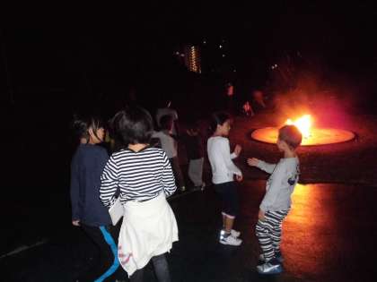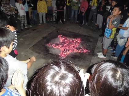 子どもたちが楽しみにしているキャンプファイヤーがはじまりました。火の神と火の子の登場です。火の子が火を点火すると大きな歓声が起こりました。最後に私から子どもたちに★のプレゼントをしました。