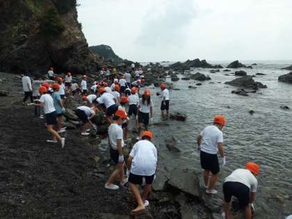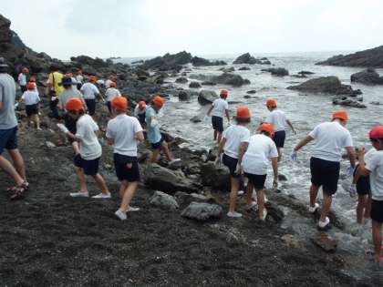 宮崎浜での磯観察です。天気もよく楽しい活動ができました。子どもたちは岩のすきまにいる貝やカニを夢中で捕まえていました。