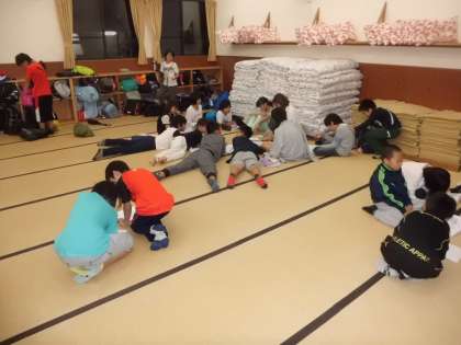 暗くて写真はとれませんでした。すみません。きもだめしコースに行く前に、私が怖い話をして10数名の子ども泣きだしリタイアしました。本当にごめんなさい。他の子どもたちは頑張って出発しました。その後、反省会をし、女子は90畳、男子はバンガローで寝ます。