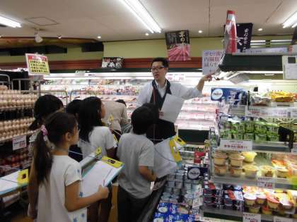 社会科の学習で「商店のはたらき」について学習しています。今日は,実際にスーパーマーケットに見学に行きました。グループごとに売り場を回り,商品の並び方や,お店の人の仕事の様子などを見たり,インタビュ−をしたりして,スーパーマーケットの仕事について調べました。見学の後は,2階のホールでたくさんの質問に答えていただきました。よい学習ができたと思います。休日などに買い物に行く機会がありましたら,ぜひ一緒に売り場の様子について注目してみてはいかがでしょうか。
