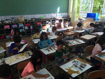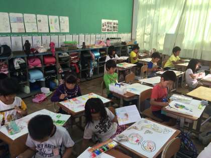 下書きも終わり,絵の具を使って,丁寧に色を塗っています。