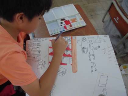 1組のお話の絵「ほんをひらいて」に一生懸命に取り組んでいます。本を読むことが好きな子が多いこのクラスにぴったりの題材です。