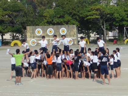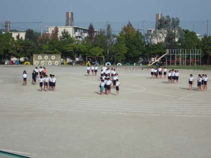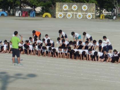 6年生がはじめて運動場で組体操の練習をしました。位置の確認や音楽のタイミングなどを練習しました。本番が楽しみです。