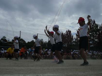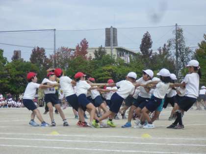 青空のもと運動会が行われました。3年生は朝から張り切っていました。80m走に障害物走,棒引き。どの競技も力いっぱいがんばりました。障害物走は,様々な障害物を「とんで,とんで,とびこえて」ゴールを目指しました。棒引きは,練習の時以上に気合が入っていて迫力いっぱいの勝負でした。総合結果は赤組が勝ちましたが,子どもたちの表情には「全力で頑張ったぞ。」という気持ちがあらわれていました。ご声援ありがとうございました。