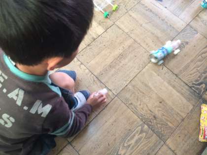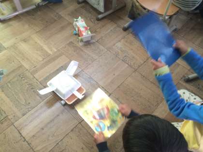風で動く仕組みなど工夫しながら,自分だけの動くおもちゃを作成中です。