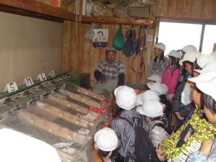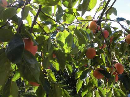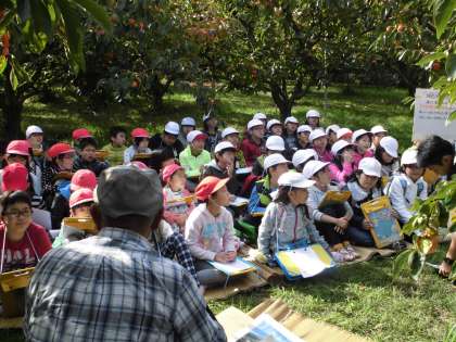 総合の学習で柿畑の見学に行きました。柿の木の下で,農家の方から,柿の育て方を教えていただいたり,柿の選別の様子を見せていただいたりしました。おいしい柿を育てるためには,太陽が大切。雨も大切。たくさんの手間をかけて育てていることを学びました。