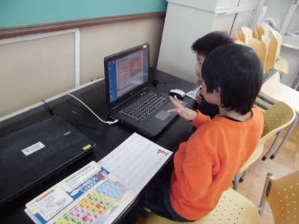 総合の学習でコンピューターの学習をしています。今日はローマ字入力で,自分の名前や学校名,簡単なメッセージなどを入れた名刺を作りました。夏休み前から学習してきたローマ字ノートを確認しながら,一文字ずつ入力していました。自分でキーボードを操作して,名前が正しく打ち出されることがとてもうれしい様で,熱心にパソコンに向かっていました。平仮名から漢字に変換する方法も覚え,また一歩,コンピューター名人に近づきました。