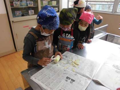 大根はピーラーで皮をむきました。少しの時間でしたが,エプロンを着て調理するのがとても楽しかったようです。