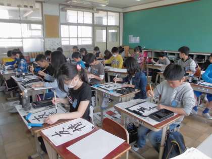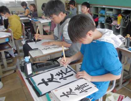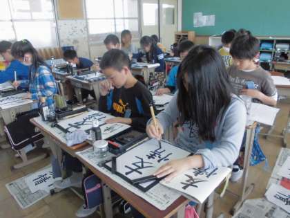 6年生での初習字で「友情」を書きました。点画のつながりや左右の組み立て方に気をつけて頑張りました。教室に掲示しますので,授業参観の際にぜひご覧ください。