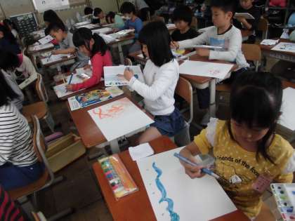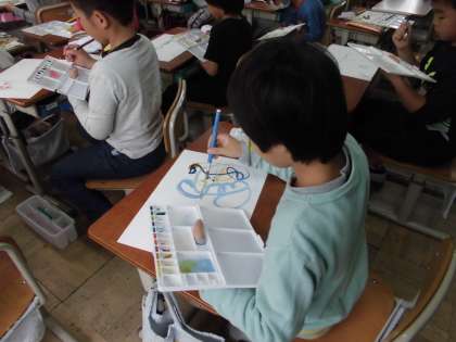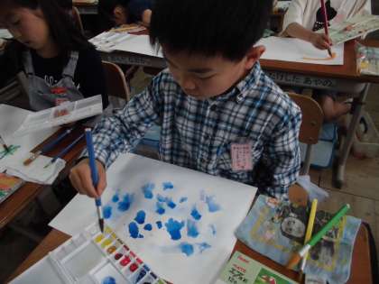 図工の学習で,自分の色や形をみつけるために絵具でいろいろ描いてためしてみました。