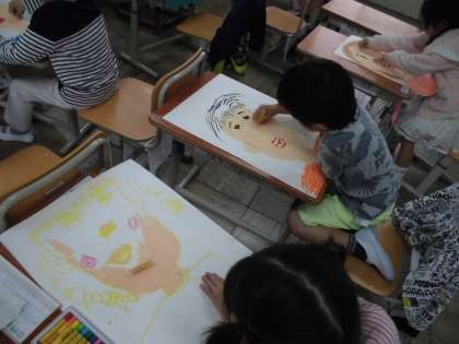 図工で自分の顔を描いています。