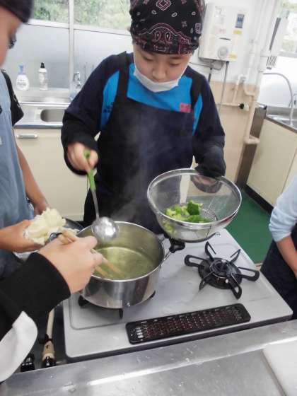 初めての調理実習に挑戦。カラフルコンビネーションサラダを作りました。人参やキャベツ,ブロッコリー。野菜によってゆで方がちがうんですね。どのグループもみんなで協力して楽しく調理を進めていました。