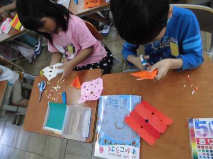折り紙の折り方や切り方を工夫して楽しく飾りを作っていました。