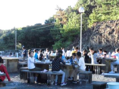 出来上がったすき焼き風煮は、いいお天気になったので、海の見えるテーブルで食べました。