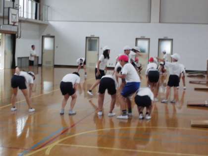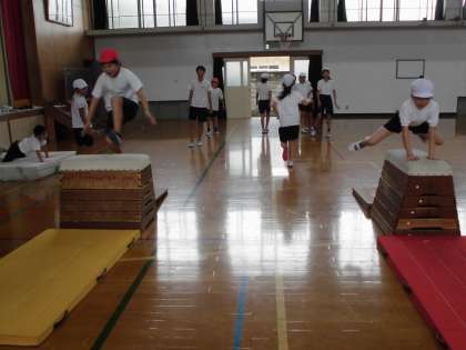 準備運動の「うまとび」と「とびあがり」をだんだんリズムよくできるようになってきました。ねらい1では,段差やロイター板を置く距離を変えてチャレンジしています。ねらい2では,少しがんばれそうな技にチャレンジ。「あおむけとび」をクリアできる人が多くなりました。「かかえこみとび」も一生懸命練習を繰り返しています。もちろん,準備もあと片付けもみんなで協力してできる5年生。すばらしい。