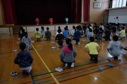 その後,狂言での動物の鳴き方や立つときの動作の仕方,歩き方について教えていただきました。