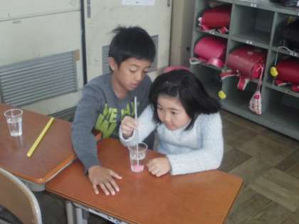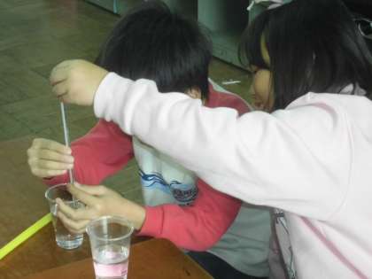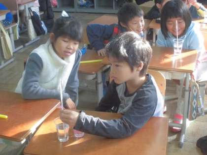 理科の学習で温度計の使い方を学習しました。使い方や取扱いの注意を教科書で確認してからお湯と水の温度を計りました。液だめの液の動きに歓声があがりました。授業後のふり返りでは「初めて使って,温度の違いがよくわかった。」「もっといろんなものの温度を計ってみたい。」という声が聞かれました。今日の学習を活かして,日なたと日陰の地面の温度をくらべる学習をします。