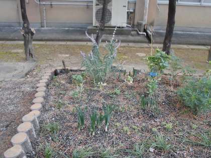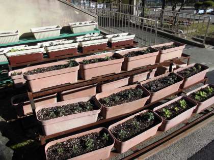 地域の方が,育ててくださった花の苗に,栽培委員会が水やりを担当しています。小さな小さな芽であったのが,少しずつ大きくなっています。中庭には花も咲いています。
