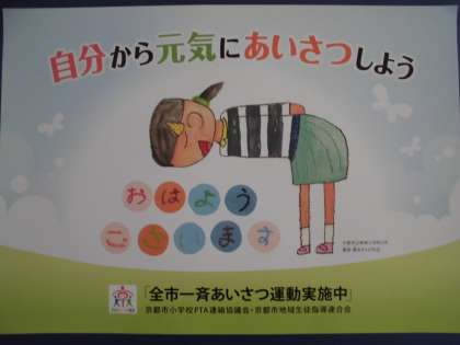 今年度,全市の学校に配布される「全市あいさつ運動」のポスターに,新林校の3年生の絵が選ばれました。朝会の最後に,そのポスターを紹介し,あいさつは人と人との大切なつながりをつくっていくこと,自分から元気に挨拶することを確かめ合いました。