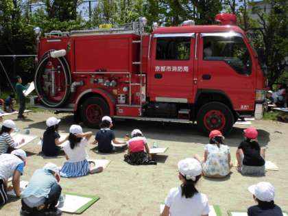 2校時に避難訓練がありました。家庭科室から出火したという設定で,真剣に安全に避難することができました。消防署の方からのお願いが4つありました。1つめは,非常ベルがなったらしずかにすること。2つめは,校内放送をよく聞くこと。3つめは,鼻と口をおさえて静かに避難すること。4つめは,家の人に訓練したことと,「火の用心してね」と話すことでした。訓練の後,低学年は消防車の写生をしました。画用紙いっぱいに消防車をかいていて,出来上がりがとても楽しみです。