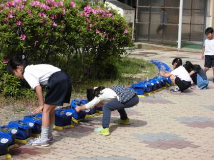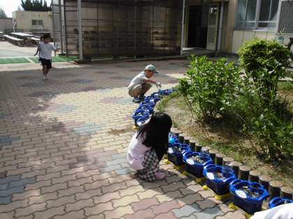 1年生が大事に植えた朝顔が,芽を出しています。覗き込んで,一生懸命に水をやっている姿が素敵です。何色の花が咲くでしょうね。