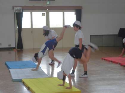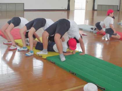 体育のマット運動では,音楽に合わせた準備運動から学習をスタートしています。また6年生では運動会の取り組みに向けての技も少し意識しながら練習をしています。その中でブリッジリレーもしました。もちろん,ねらい2では一人ひとりが新たな技に挑戦しています。今後もみんなで楽しみながら協力しながら学習をすすめていこうと思います。