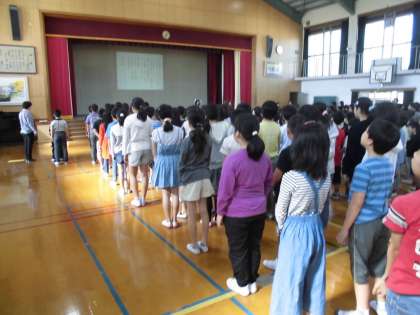 児童集会にてそれぞれの学級の人権標語を発表しました。