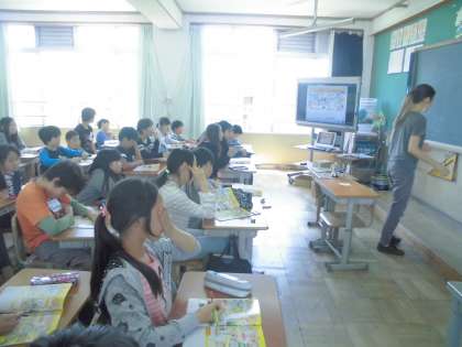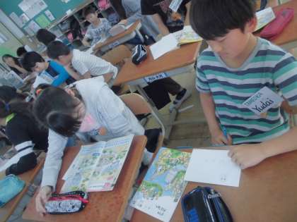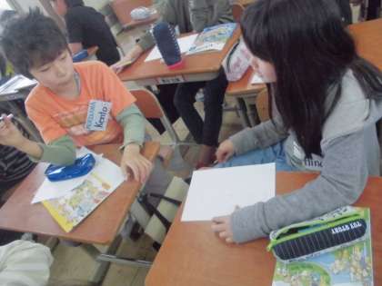 今年も外国語の時間には,マリダ先生に来ていただいています。今日もラインゲームから始まり,楽しい1時間となりました。「Do you have”J”?]「Yes,I do.」相手の考えたキーワードにそれぞれのアルファベットが入っているかどうか尋ねながら,キーワードをあてていくゲームをしました。