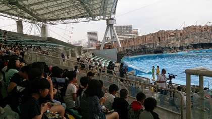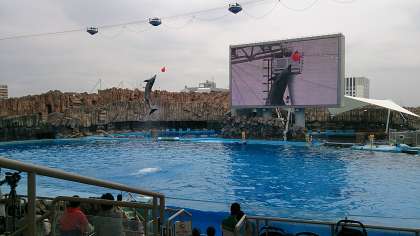 イルカたちの高いジャンプに食べる手が止まっていました。