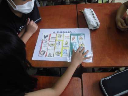 今日は3年2組で食の学習がありました。いろいろな食材を赤・黄・緑の仲間に分類しました。