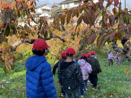 特別に柿農園の中まで入らせていただき、柿がどのように実るのか見学させていただきました。中には初めて柿が実っているところを見て、「こんな感じで実るのか!」と感動している子もいました。とても貴重な経験をさせていただきました。