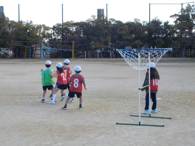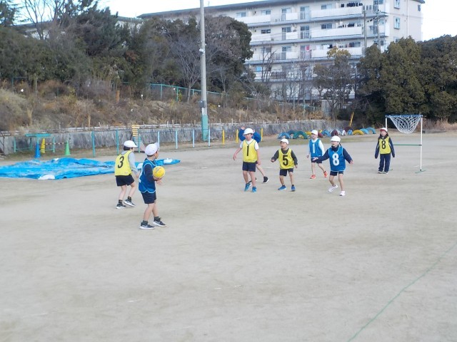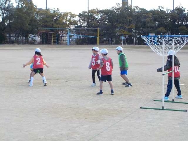 体育「パスゲーム」の学習は、寒い中みんな楽しそうに活発に活動しています。