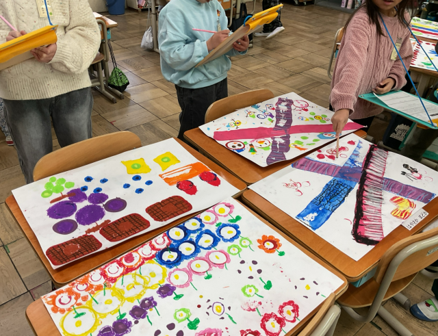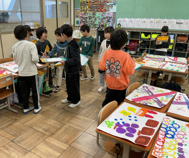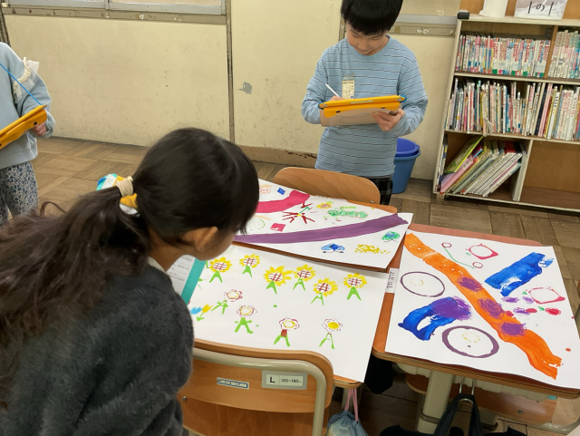 ともだちのさくひんを見て、「これはブドウに見える!」「うずまきがあるからカタツムリかな?」とさまざま見えかたをたのしんでいるすがたがすてきでした。