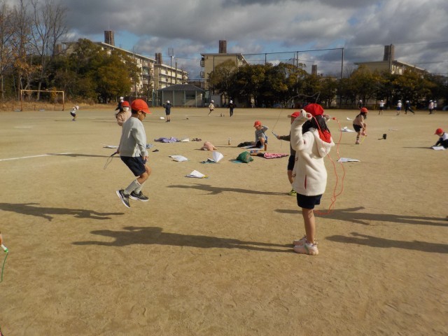 その後なわとびをしました。両足とびやあやとびなどいろいろなとび方を楽しんでいました。