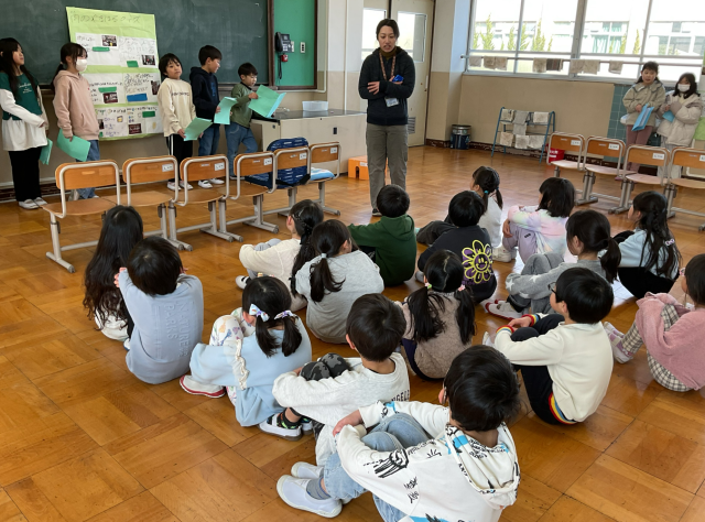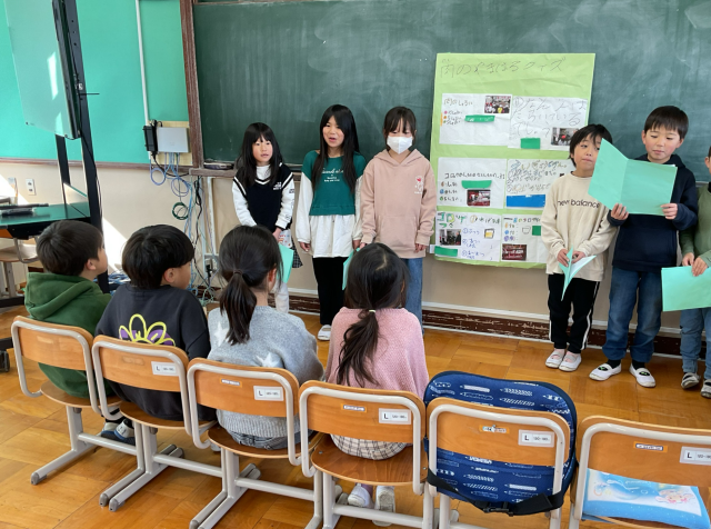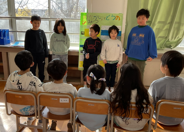 2年生が生活科の学習で、新林学区のお店屋さんへインタビューしに行って知ったことを1年生に発表してくれました。