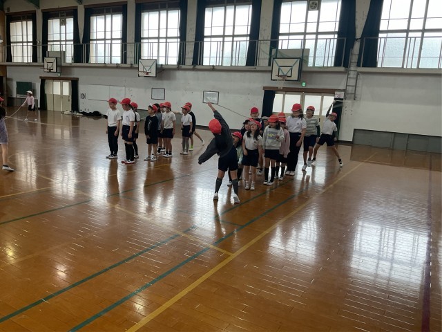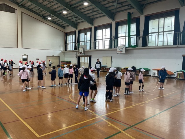 3学期始まって最初の体育は大縄跳びで体をほぐしました。子どもたち同士で声をかけたり、数を数えたりしながら息を合わせて跳んでいました。