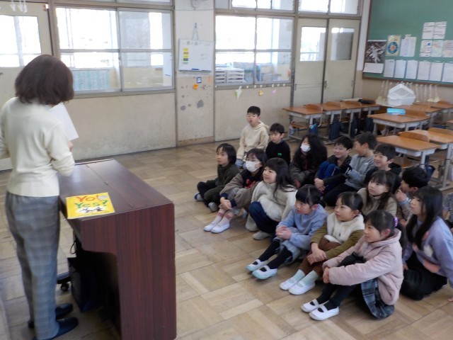 2月4日(水)に雪ん子読書週間の一環として2年2組に地域の方に来ていただき「こぶとりじいさん」のお話を読聞かせしていただきました。表現豊かに読聞かせをしていただき、子どもたちはとても楽しそうに聞いていました。「こぶとりじいさん」を初めて聞く子どもが多くいて、みんな一生懸命聞いていました。