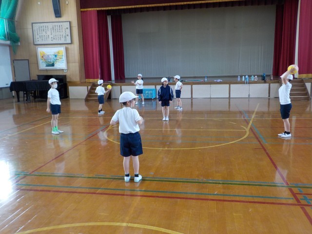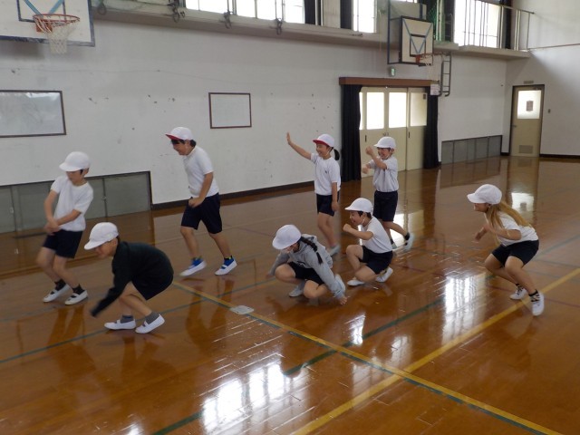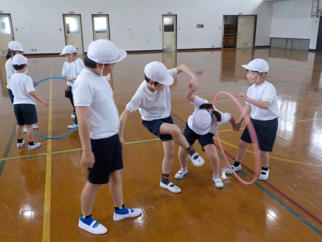 体育「体ほぐしのうんどう」では、グループでまねっこ歩きをしたりフラフープリレーをしたりしました。フラフープリレーでは、より早くフラフープを通すにはどうすればよいかみんなで考えていました。ほかにもボールを使った体ほぐしの運動を楽しんでいました。