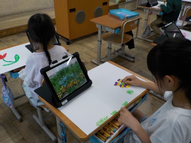 桜やパンジー、ノースポールなど思い思いの春を感じるものを絵に表しました。
